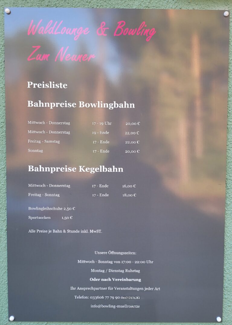 Wir Suchen Dich ! Öffungszeiten / Preise 7. Oktober 20258. August 2025 von Martin02 Wir suchen Dich, in Teil – oder Vollzeit! Klick auf, Neu bei uns, „WaldLounge & Bowling Zum Neuner“ Zum Neuner 12,Inh. Martin Geue Tel. 033606777990E-Mail: info[at]bowling-muellrose.deHier klicken